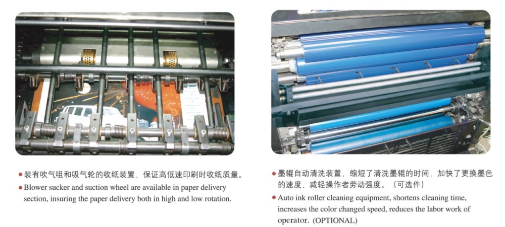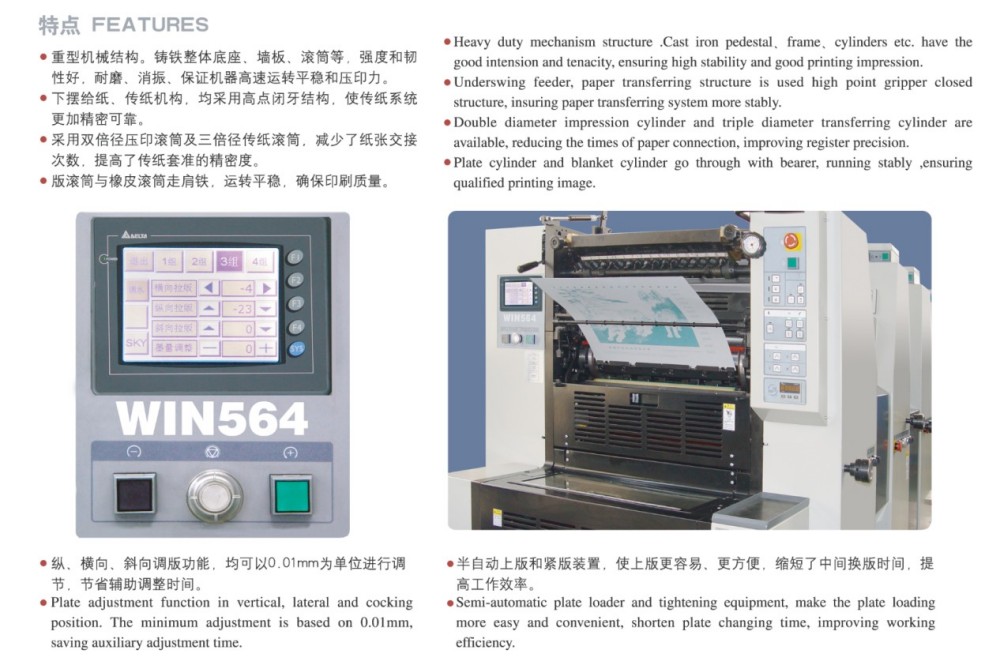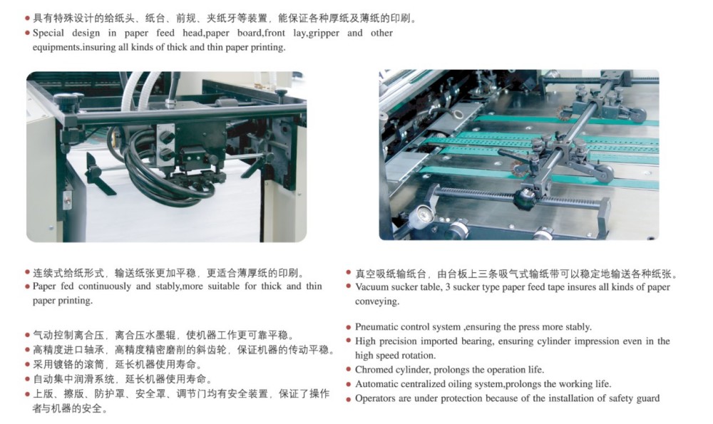 A2 ஃபோர்-கலர் ஷார்ட்-ரன் பிரிண்டிங் ஆஃப்செட் பிரிண்டிங் பிரஸ்ஸுக்கு வரும்போது, ​​இது உயர் செயல்திறன் கொண்ட தொகுதிக்கூறுகளுடன் கட்டமைக்கப்பட்டுள்ளது, இது குறுகிய கால அச்சிடும் பணிகளுக்கு ஏற்றது. இந்த தொகுதிகள் உயர் துல்லியமான உருளைகள் மற்றும் கியர்கள், ஒரு வலுவான காகித உணவு நுட்பம், ஒரு துல்லியமான காகித பதிவு அமைப்பு மற்றும் ஒரு நிலையான மை விநியோக அமைப்பு ஆகியவை அடங்கும். உயர்தர, திறமையான மற்றும் செலவு குறைந்த, குறிப்பாக குறுகிய கால வேலைகளுக்கு, கட்-ஷீட் வண்ண அச்சிடலுக்கான சந்தையின் தேவைகளை இது பூர்த்தி செய்கிறது. இது 0.04 மிமீ மெல்லிய காகிதத்திலிருந்து 0.4 மிமீ தடிமனான அட்டை வரை பரந்த அளவிலான காகித தடிமன்களைக் கையாள முடியும். மற்றும் அதன் தொடுதிரை கட்டுப்பாடு மற்றும் உள்ளுணர்வு நிரலாக்க இடைமுகம், நீங்கள் எளிதாக அனைத்து அமைப்புகள் மற்றும் அச்சிடும் அளவுருக்கள் ஸ்மார்ட் மாற்றங்களை செய்ய முடியும்.