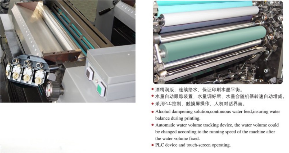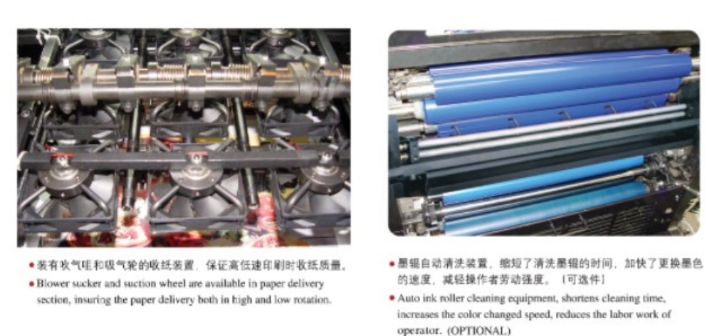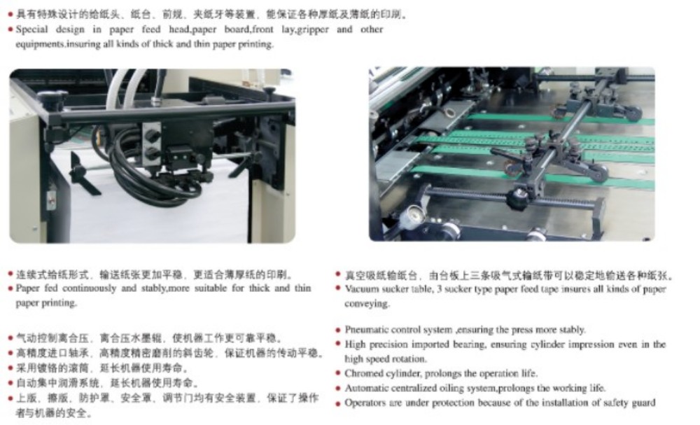 பெரிய A3 நான்கு வண்ண லேபிள் பிரிண்டிங் ஆஃப்செட் பிரிண்டிங் பிரஸ் உயர்-செயல்திறன் தொகுதிகளுடன் வடிவமைக்கப்பட்டுள்ளது, மேலும் அவை அனைத்தும் சிறந்த தரம்-உயர் துல்லியமான உருளைகள் மற்றும் கியர்கள், வலுவான காகித உணவு முறை, உயர்-துல்லியமான காகித பதிவு அமைப்பு மற்றும் நிலையான மை விநியோக அமைப்பு. உயர்தர, திறமையான மற்றும் மலிவு விலையில் கட்-ஷீட் வண்ண அச்சிடலுக்கான சந்தையின் தேவைகளைப் பூர்த்தி செய்யும் வகையில் இது வடிவமைக்கப்பட்டுள்ளது. நீங்கள் ஒரு காகித தடிமனுடன் ஒட்டிக்கொள்ள வேண்டியதில்லை - இது மெல்லிய காகிதத்துடன் (0.04 மிமீ) தடித்த அட்டை (0.4 மிமீ) வரை வேலை செய்கிறது. உள்ளுணர்வு நிரலாக்க இடைமுகத்துடன் கூடிய தொடுதிரை கட்டுப்பாடும் உள்ளது, இது அமைப்புகளையும் அச்சிடும் அளவுருக்களையும் ஸ்மார்ட், நேரடியான வழியில் சரிசெய்ய உங்களை அனுமதிக்கிறது.